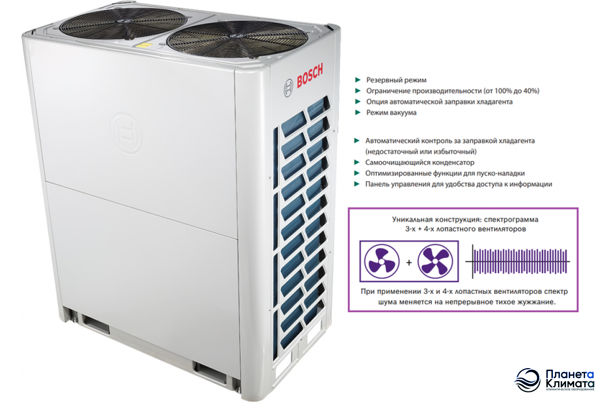 Наружные блоки VRF-систем серии AF5300A_С от компании Bosch представлены большим количеством моделей мощностью от 25,2 до 90,0 кВт, оснащенных спиральный компрессор с впрыском пара. Таким образом, можно достичь коэффициента использования производственных мощностей от 50% до 130%. Все агрегаты выполнены из качественных материалов и комплектующих, что гарантирует длительный срок эксплуатации.