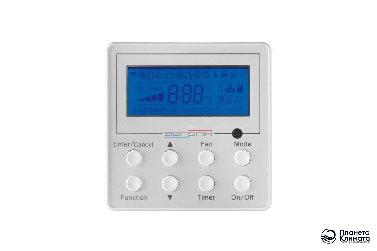 Для быстрого и удобного управления канальным кондиционером Аэроник AFH36K3HI / AUHN36NM3HO используется проводной пульт, который входит в комплект поставки. На нем отображается не только температура воздуха в помещение, но и температура воздуха снаружи. Это возможно благодаря двум датчикам. Один из них расположен на воздухозаборнике внутреннего блока, в другой - внутри проводного пульта управления. Пользователь может самостоятельно выбрать, какой из датчиков будет использоваться, в зависимости от требований и конструкции помещения.