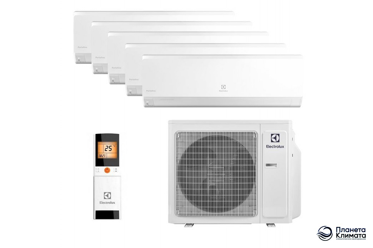 Мультисплит система инверторного типа Electrolux EACS/I-07HP FMI/N8_ERP x 5 / EACO/I-42 FMI-5/N8_ERP создает оптимальную температуру воздуха сразу в пяти комнатах. Предназначена для помещений до 21 + 21 + 21 + 21 + 21 кв.м. В данной комбинации есть один наружный блок и 5 настенных блока из серии Portofino. У каждого внутреннего блока имеется свой пульт управления для точной регулировки в определенном помещение.